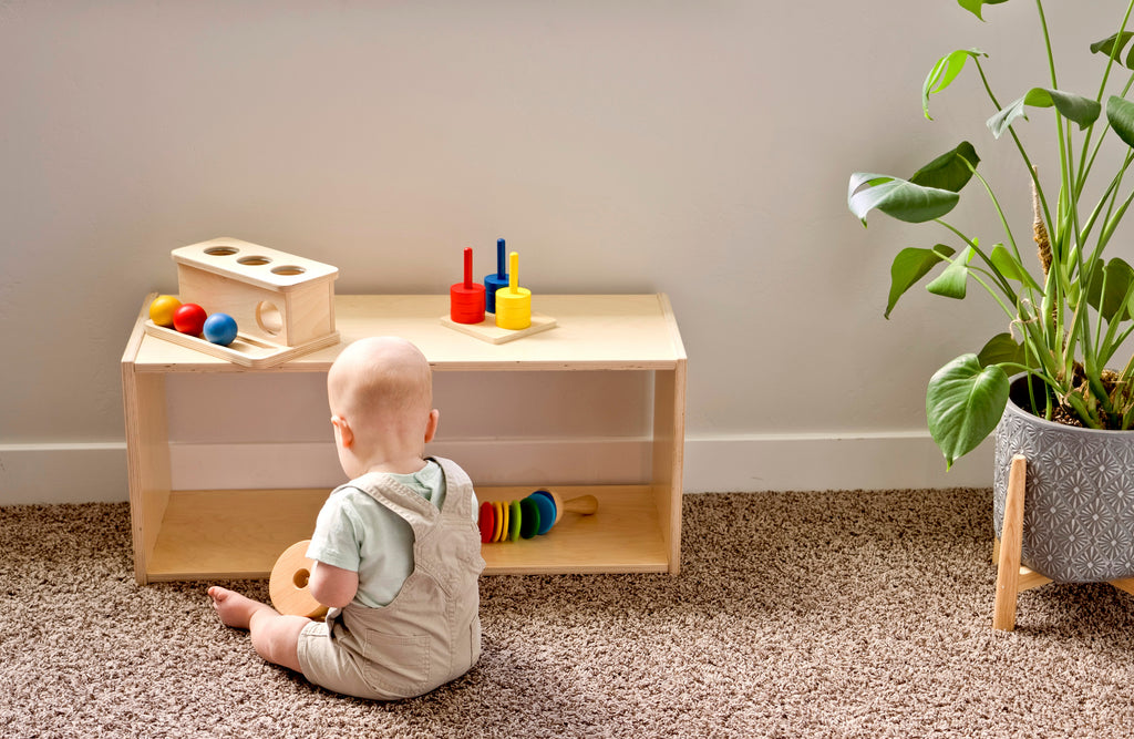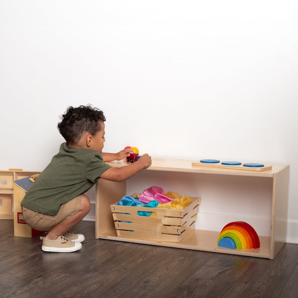 - The Birch Montessori Infant Shelf comes with finished faces and burnished edges and assembles easily with no tools or hardware.